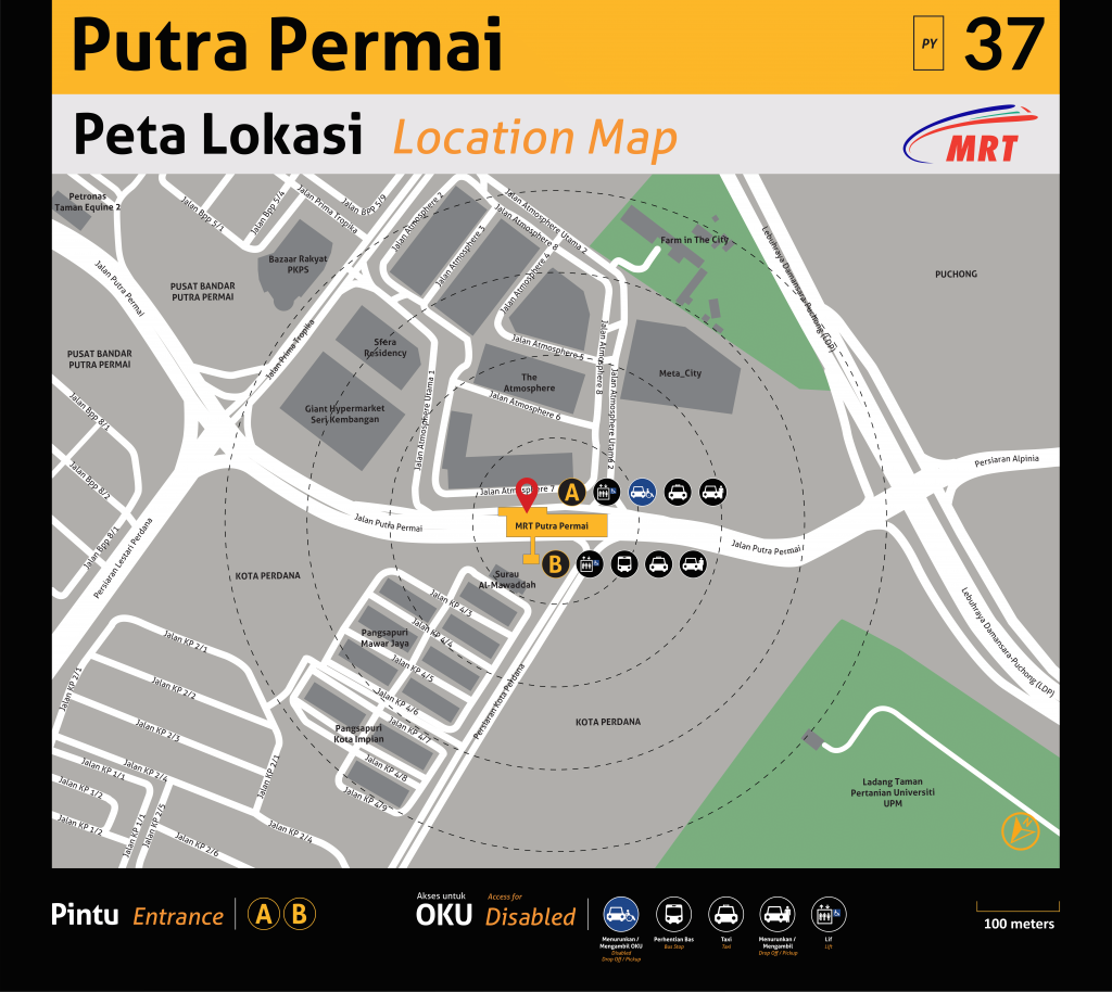 The area features apartments, landed homes, and local businesses, framed by green spaces and key roads like Jalan Putra Permai and the KL-Seremban Highway. The station has two entrances—Entrance A along Jalan Atmosphere Utama 3 and Entrance B along Jalan Putra Permai—both equipped with covered walkways, a Park and Ride facility, and feeder bus services (T544 to Taman Lestari Putra), making it a convenient transit hub.